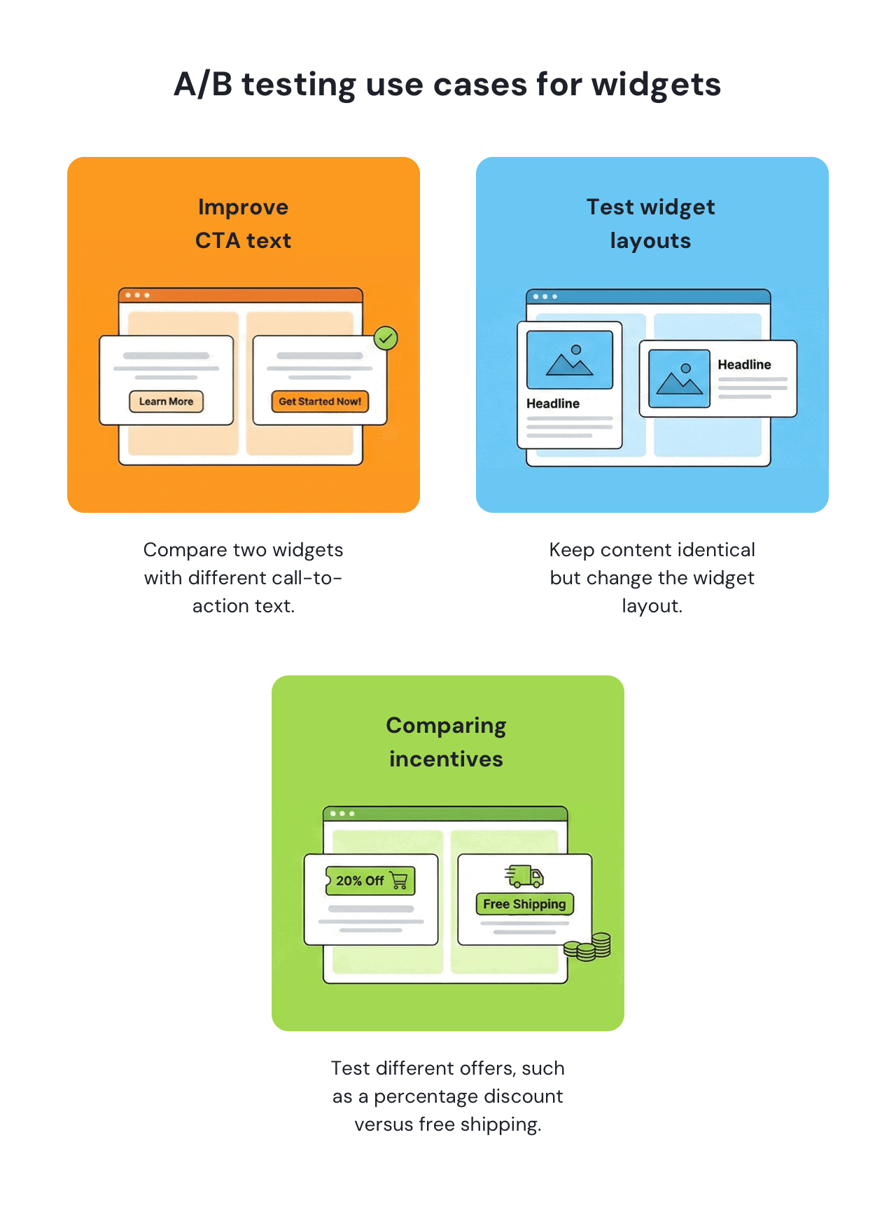 A/B testing can be used to evaluate many aspects of a widget, from wording and layout to the type of offer shown. The following examples illustrate common use cases and show how small, focused changes can be tested to measure their impact on user behavior.