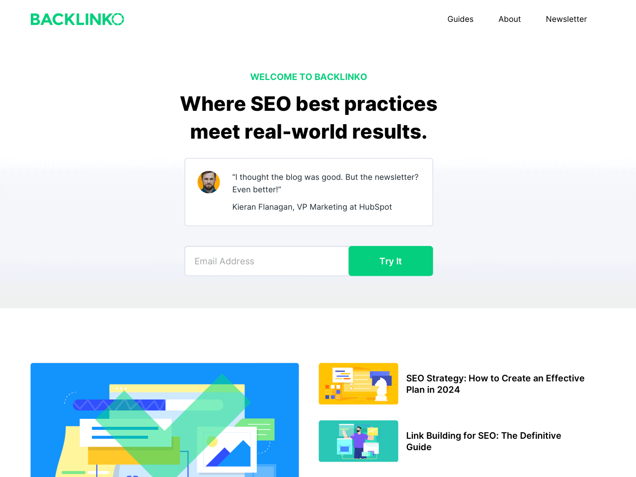 Backlinko, an SEO blog by Brian Dean, uses several inline newsletter signup forms across the site. For example, the form on the homepage is supported by a shiny testimonial.