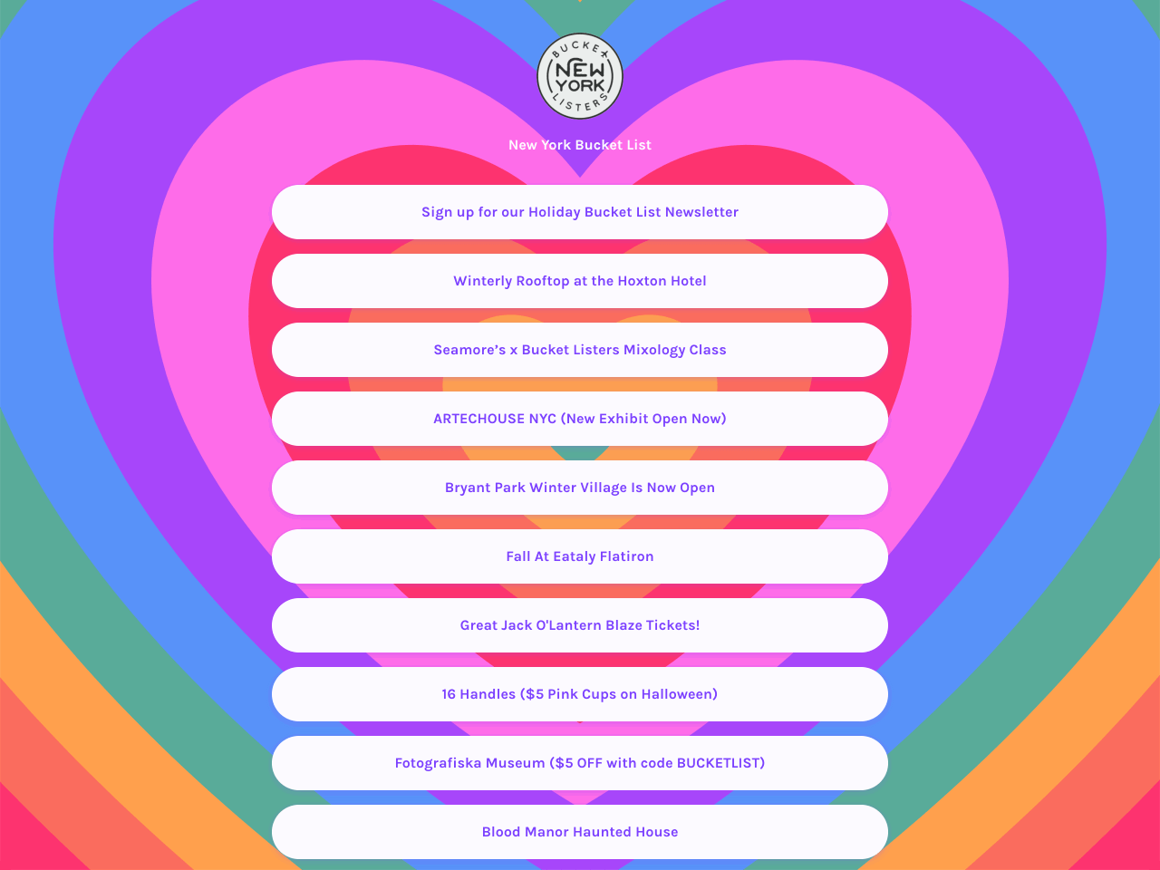 New York Bucket List uses a smart strategy to turn social media followers into email newsletter signups. It links to a mobile-optimized landing page directly from their Instagram bio. The top button opens a newsletter signup form, while the rest direct traffic to relevant content and promos.