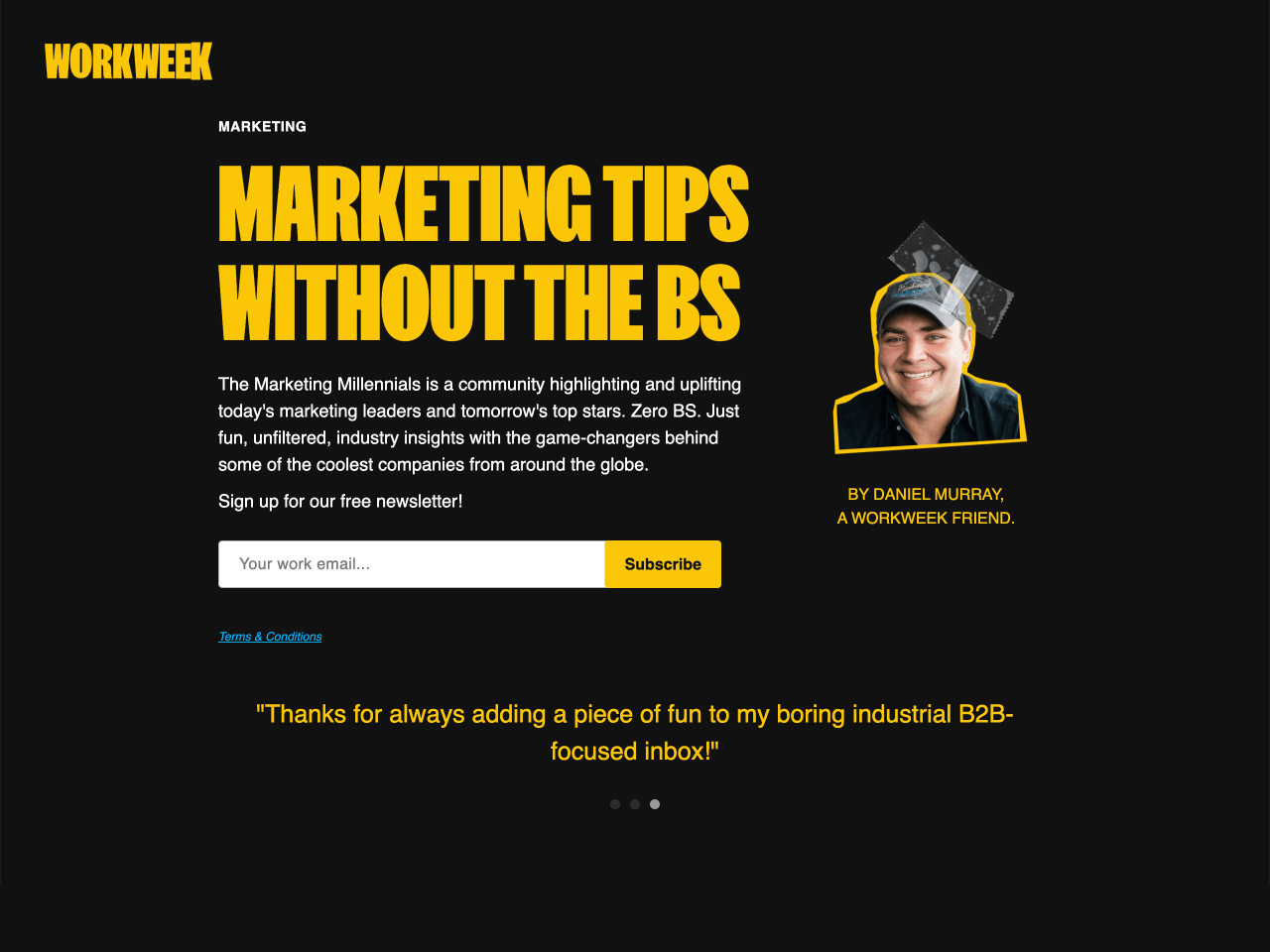 Marketing Millennials is a popular newsletter about modern marketing trends. Their signup form lives on a dedicated landing page, and what makes it stand out is the copy. Everything from the author intro to the testimonials is designed to build trust and excitement.