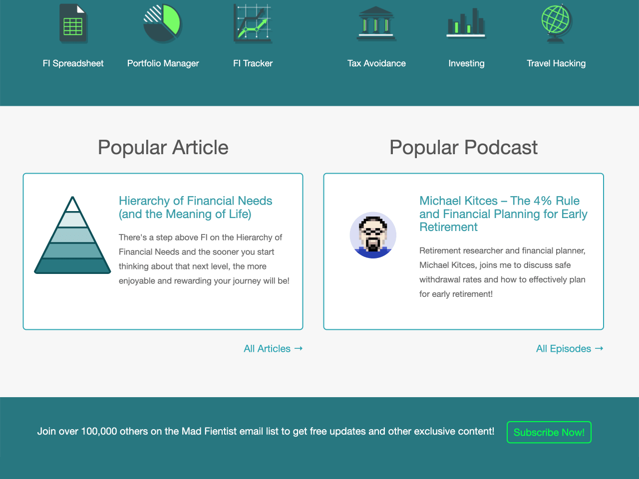 Mad Fientist, a personal finance blog, uses a two-step signup form that begins with a subtle sticky bar at the bottom of the page.