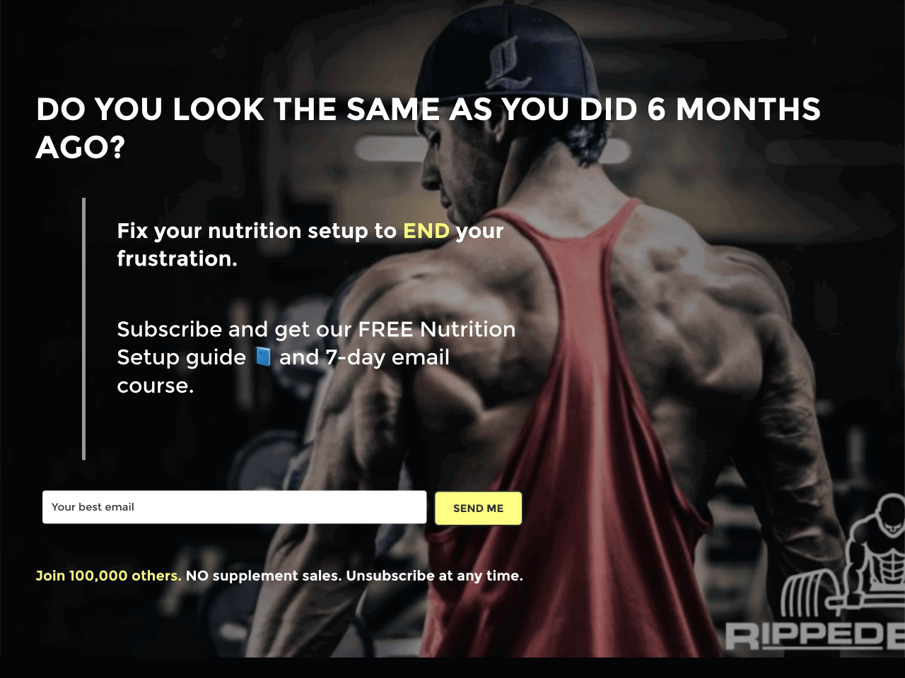 Ripped Body, a fitness site run by coach Andy Morgan, greets visitors with a clean embedded form offering a free “Nutrition Setup Guide” and a 7-day email course, right on the homepage.
