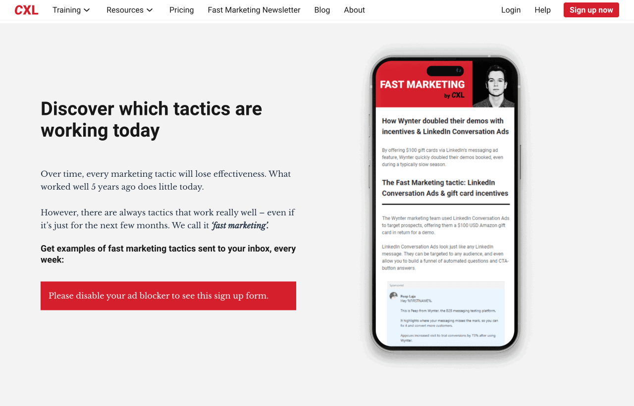 CXL, a leading conversion optimization blog, uses a newsletter signup form that focuses entirely on clarity and value. The copy sets up a problem marketers face, and then positions the newsletter as the solution.