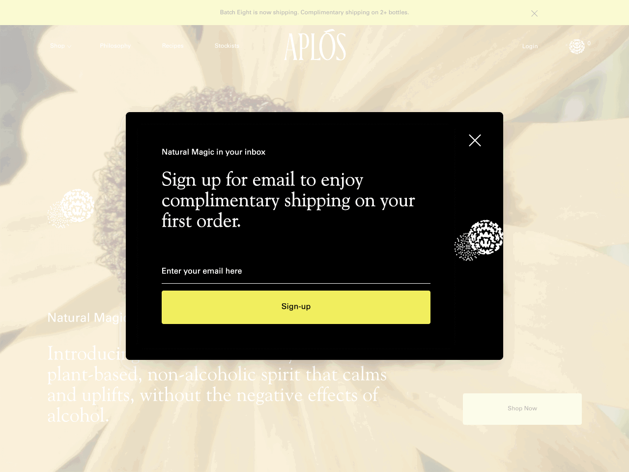 Aplos, a non-alcoholic spirit brand, uses a sleek pop-up form offering free shipping to first-time subscribers. The form delivers an impressive 11% email signup rate.