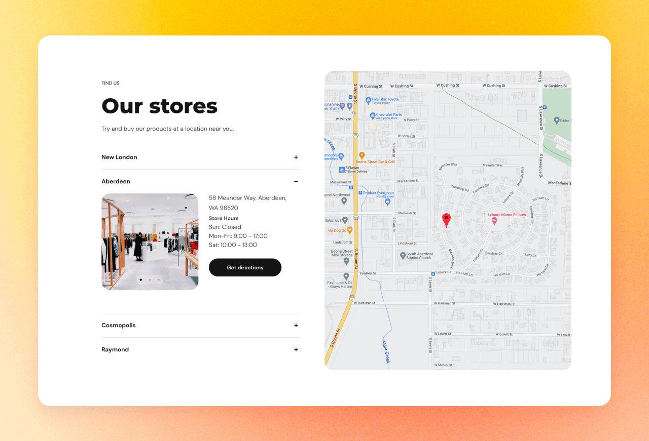 Aurora’s intuitive store locator feature (Map) provides customers with turn-by-turn directions to your nearest brick-and-mortar store.