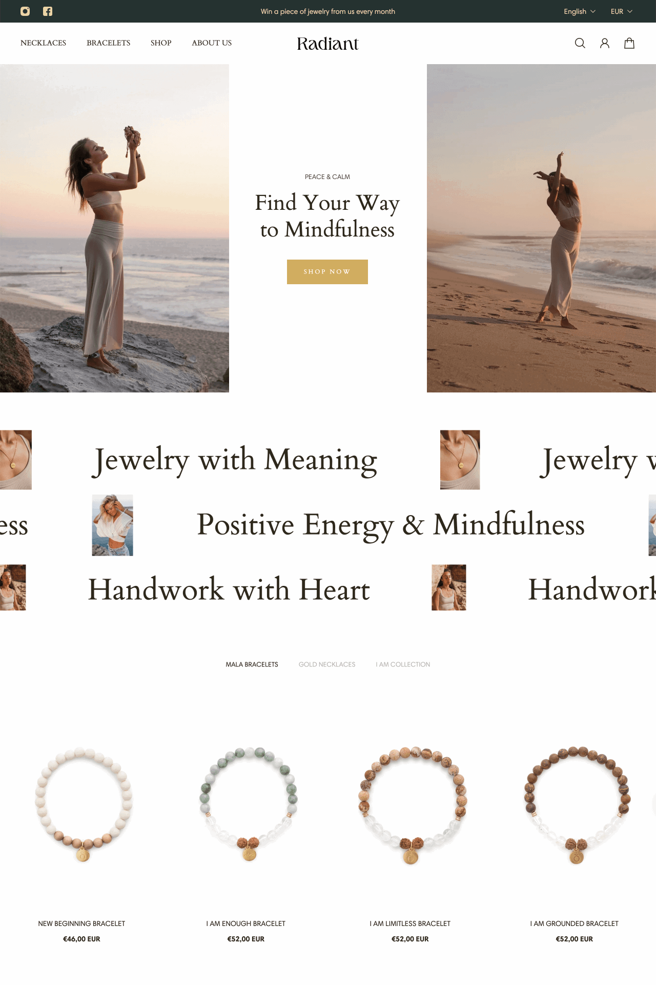 Aurora 3.0 debuts 'Radiant,' a theme style crafted specifically for jewelry brands. Its product-focused design, complemented by soft color tones, beautifully highlights the elegance of various jewelry pieces, from rings and bracelets to necklaces.