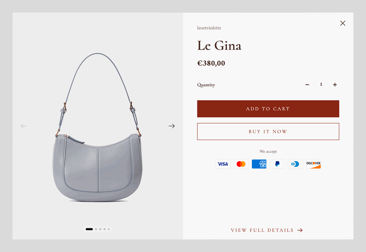 Quick view has been redesigned to give you more layout flexibility. In addition to the classic drawer, you can now display product previews in a modal window with a horizontal media gallery. It has also become a standalone theme section — so be sure to add it after updating your theme.