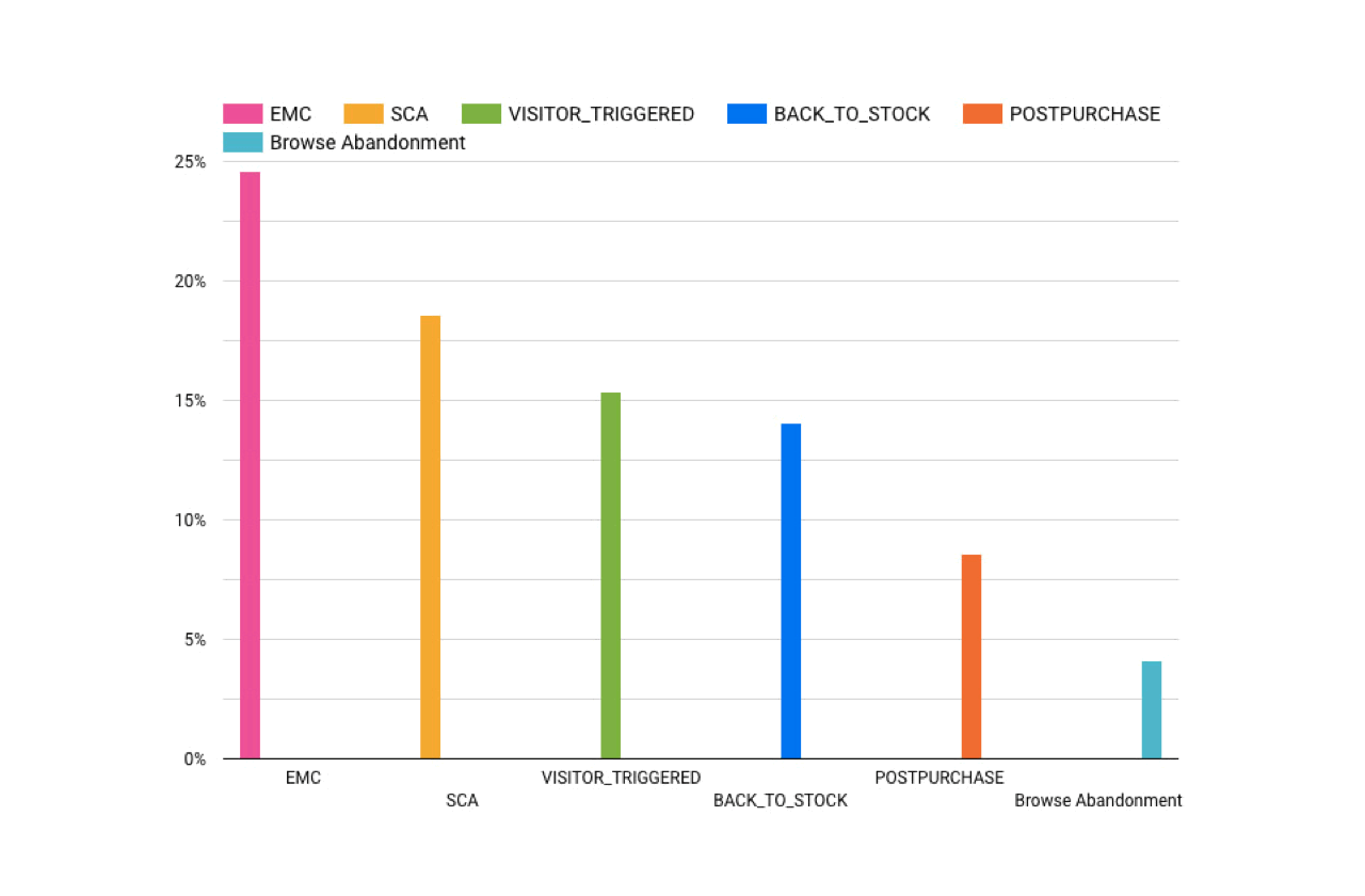 Their research also found that back-in-stock email campaigns had an average open rate of 65.32%, which was almost 70% better than post-purchase emails, the lowest performing email campaign type analyzed.