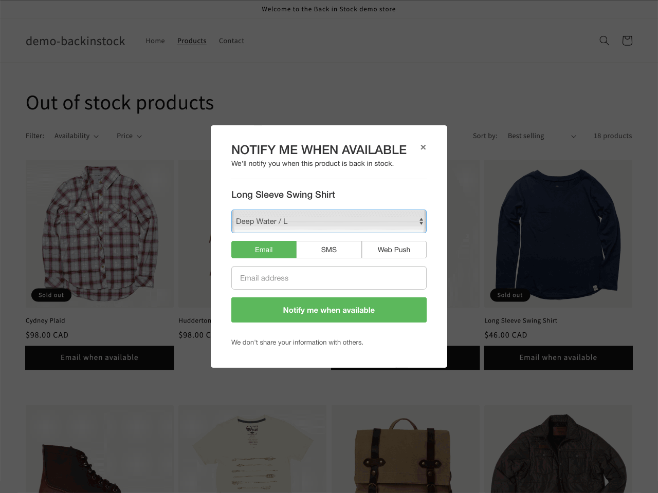 Unfortunately, Shopify doesn’t have in-built capabilities for signing up visitors who find an “Out of Stock” message. That’s why you want to install an app specifically for this purpose.