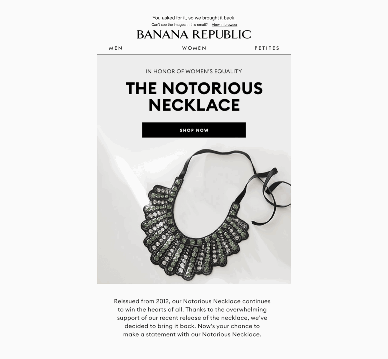 One exception to this rule is when you relaunch a seasonal product. In that case, you’re not saying a product is back in stock, but that a whole category of products is.