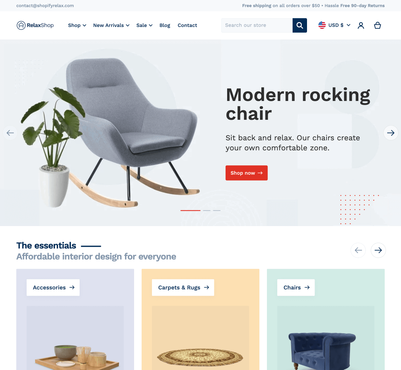 If you’re just getting started or if you’re on a tight budget, consider the Relax theme from Swissuplabs. The theme is set up with beginner merchants in mind, so you don’t have to do much customization to launch your home decor store. This Shopify theme includes various cross-selling and upselling features to help you boost sales. It’s also the most affordable Shopify theme on this list.
