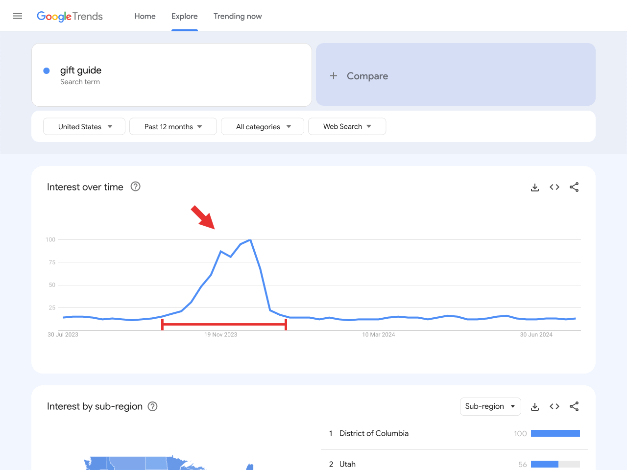 As you can see in the image above, people search for “gift guides” during the months before Black Friday and Christmas, proving they are perfect for these dates.