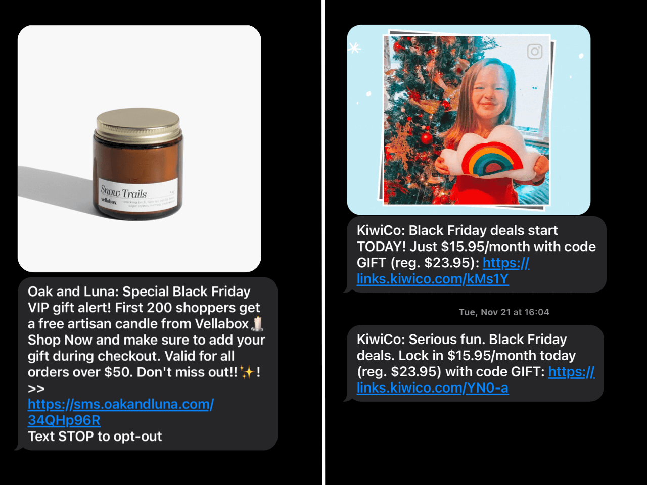 Brands like KiwiCo and Oak and Luna use SMS marketing to announce sales, promote special offers, keep their products top of mind, and remind customers when the sale ends.
