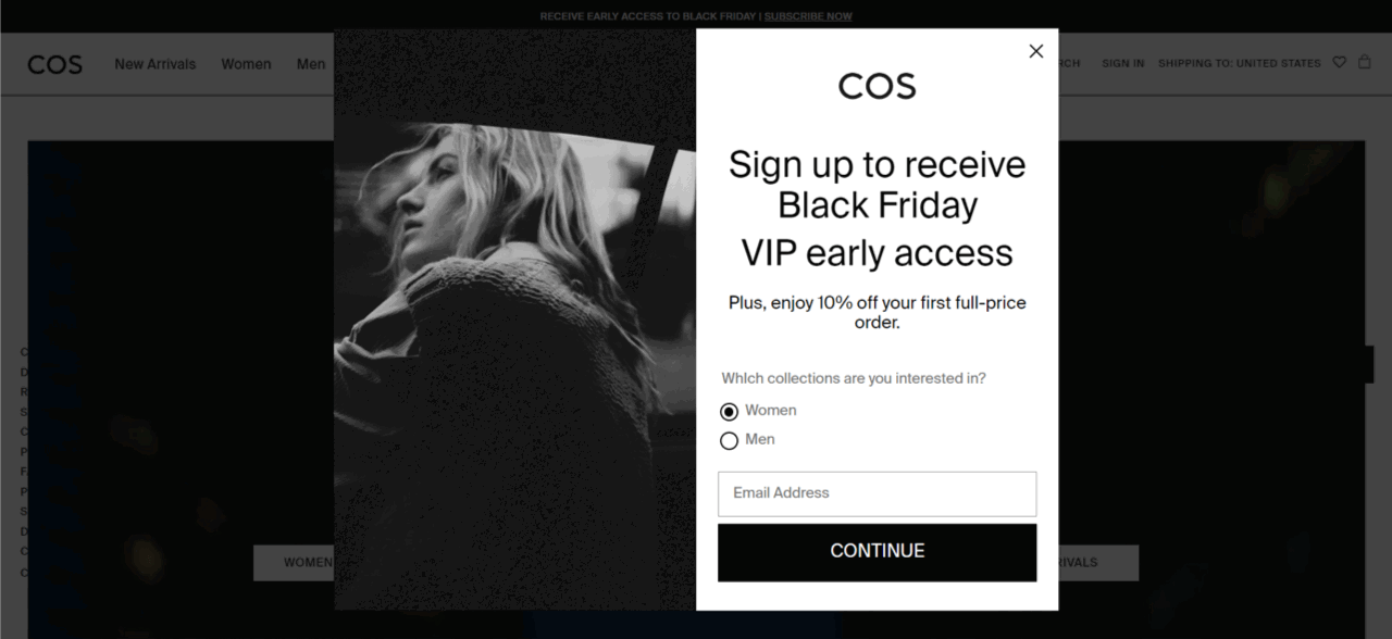 That depends on your strategy. If you choose to launch an early sale for subscribers or VIP members, you can mention that on your email signup form and send a deep discount code to those who fill it out. That’s how COS did it, in the example below.