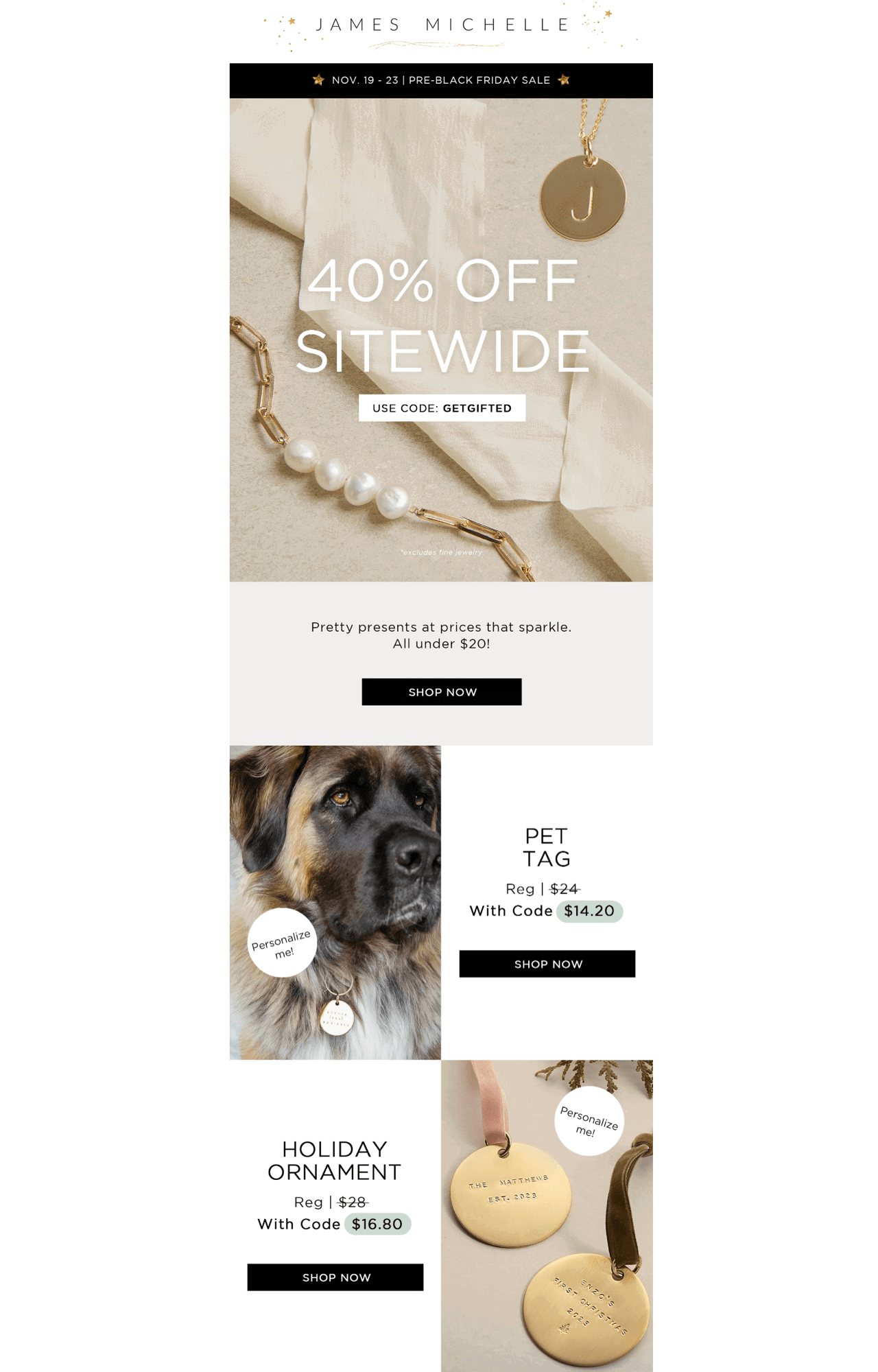 In this case, you’ll need to email your subscribers about the start of the Pre-Sale and send them a coupon that is exclusive to them. For example, James Michelle sent the following email to subscribers announcing a 4-day Pre-Black Friday sale and featuring a 40% discount coupon.
