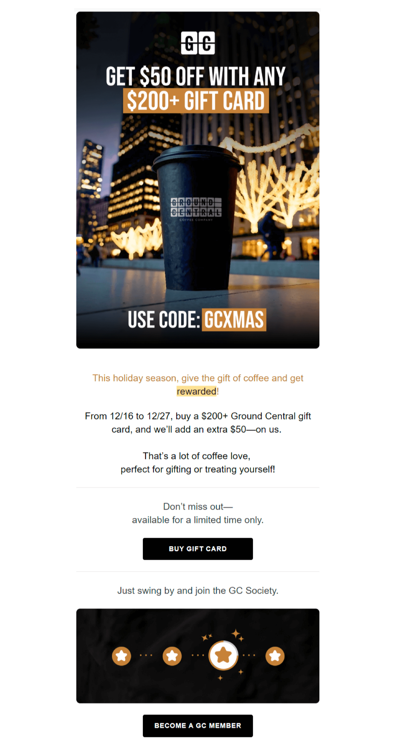 Even a small incentive goes a long way. Ground Central Coffee, for example, offered an extra $50 bonus when customers purchased a $200+ gift card — framing it as a limited-time thank-you for their community members.