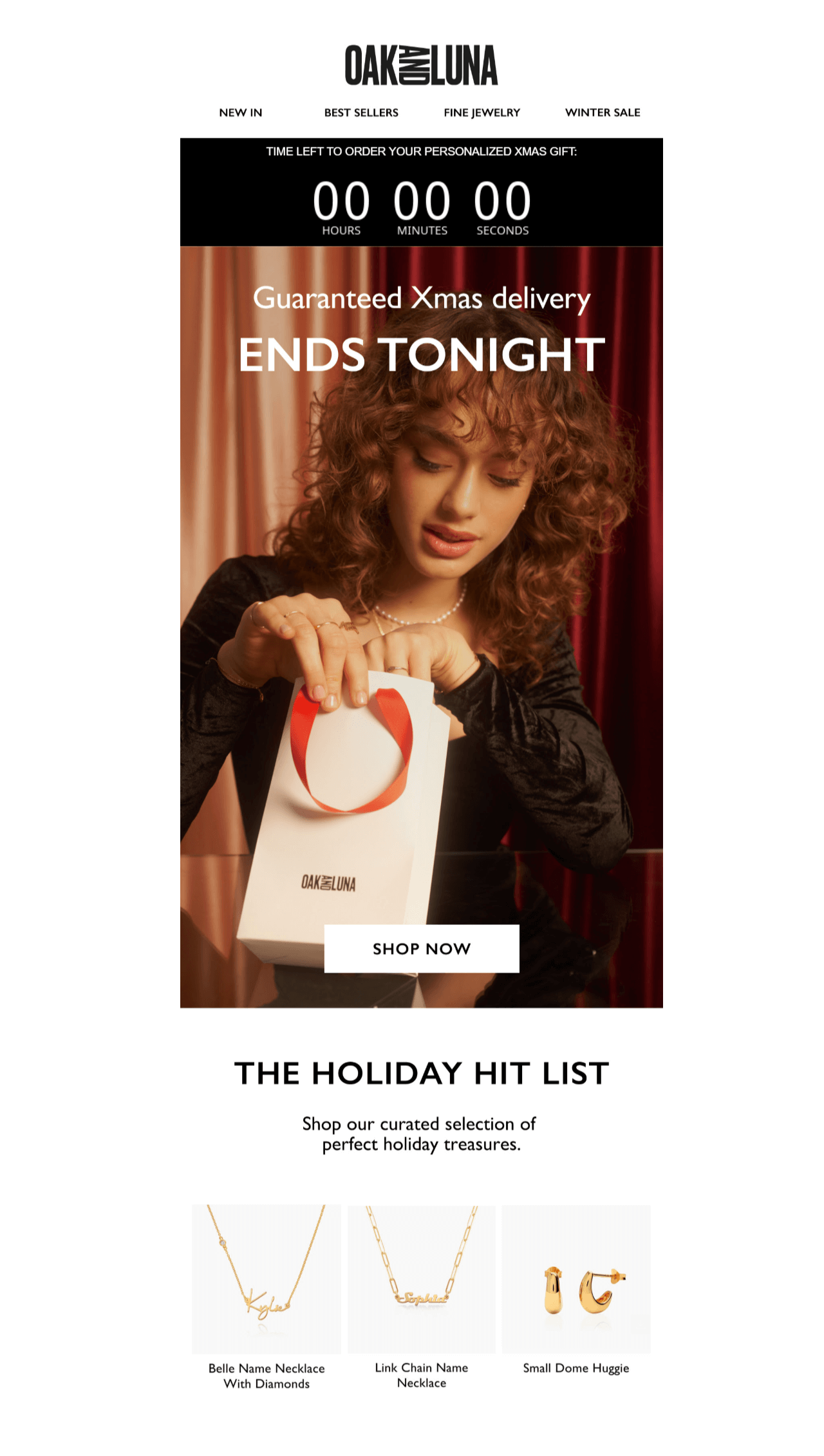 Here is an example of a jewelry brand Oak & Luna using a prominent countdown banner in their “Guaranteed Xmas Delivery Ends Tonight” email to convert last-minute buyers.