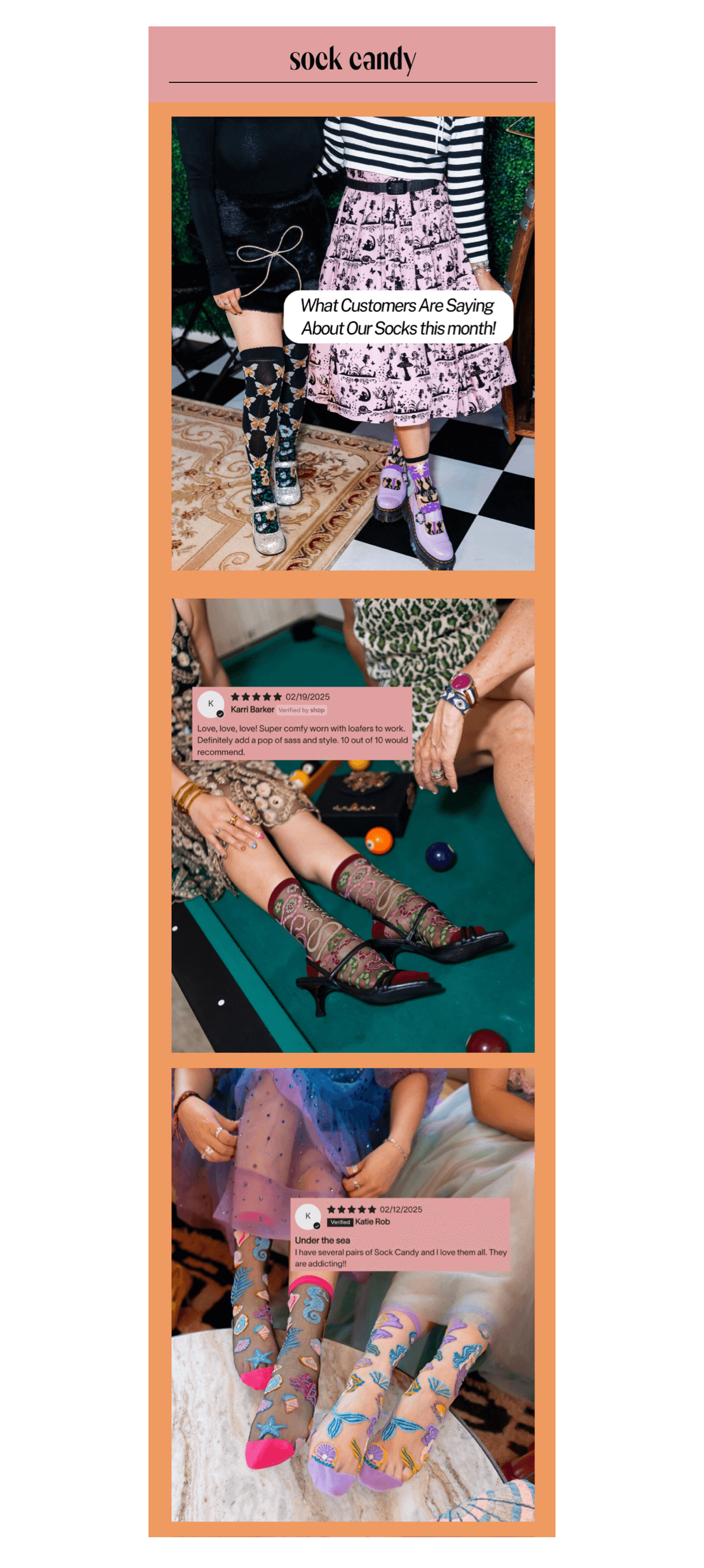 Sock Candy highlights customer reviews with real photos under the headline “What Customers Are Saying About Our Socks This Month!” The visual proof shows customers wearing their products and sharing their feedback.