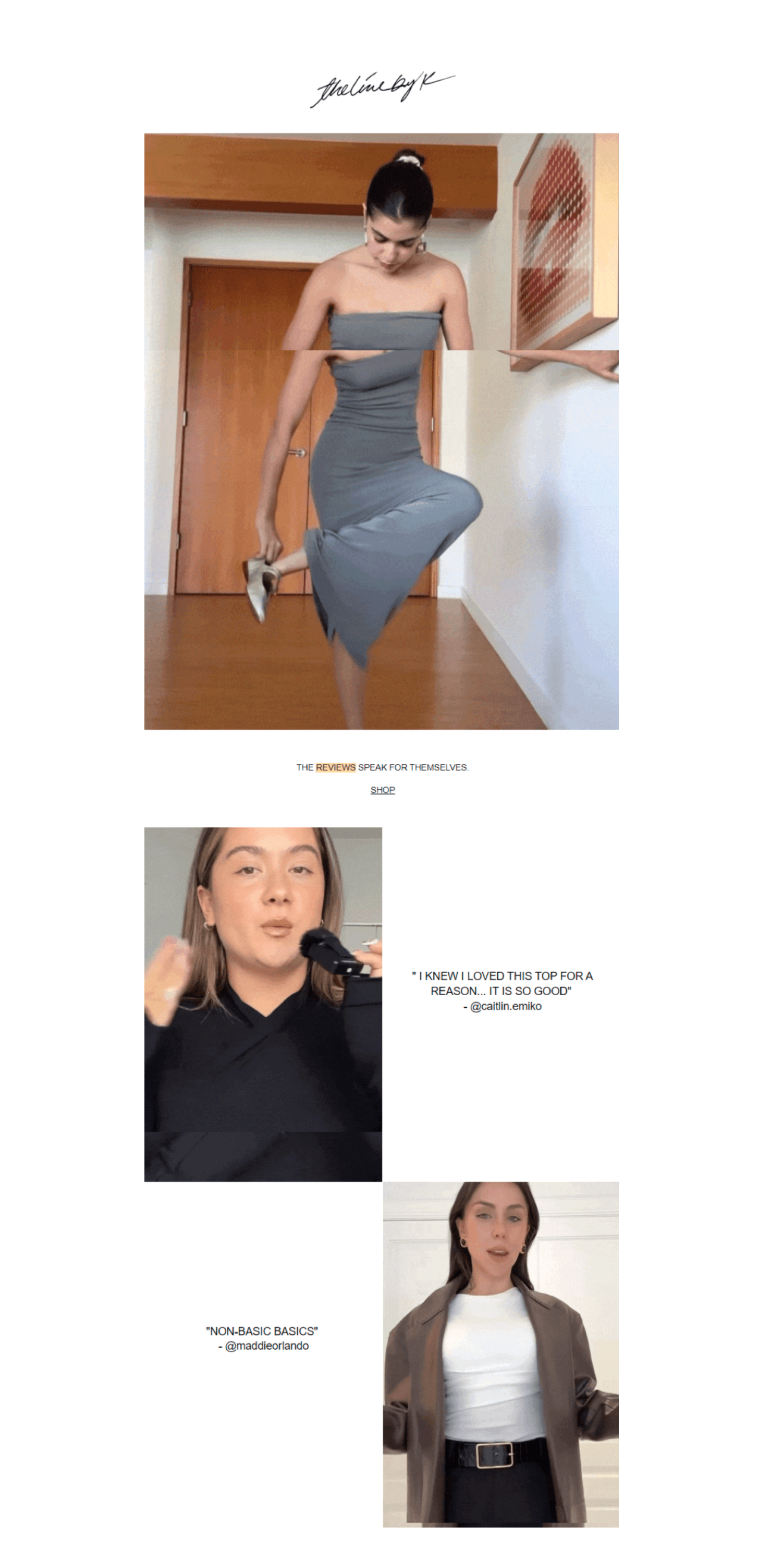 If you’re ready to go the extra mile, follow the example of Line by K, featuring video clips and screenshots of customers reviewing products on TikTok and Instagram, in a dedicated email campaign.