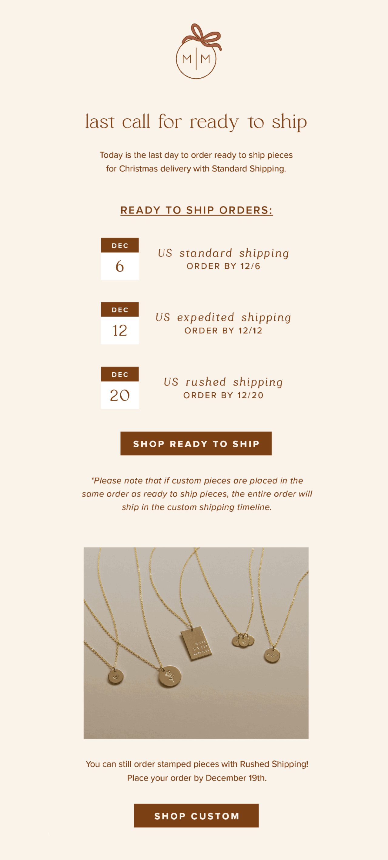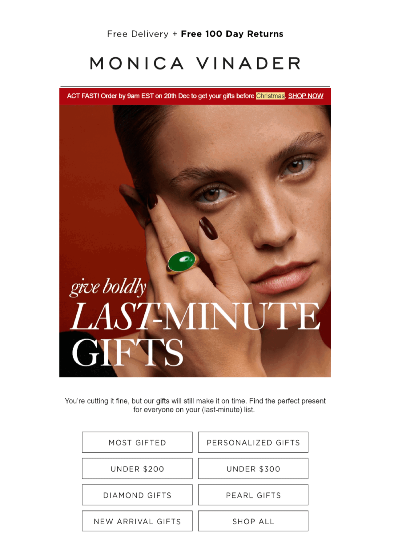 Monica Vinader nails this approach with a simple headline: You’re cutting it fine, but our gifts will still make it on time. The message is reinforced with a clear deadline to place an order.