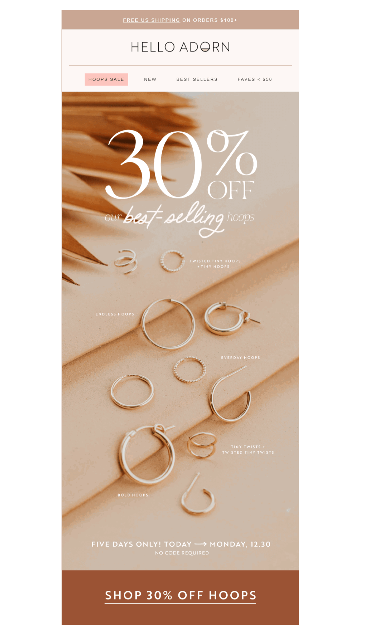Hello Adorn tapped into this trend by launching a post-Christmas sale on December 26th — offering 30% off best-selling hoops for five days. The campaign was simple, effective, and required no discount code.