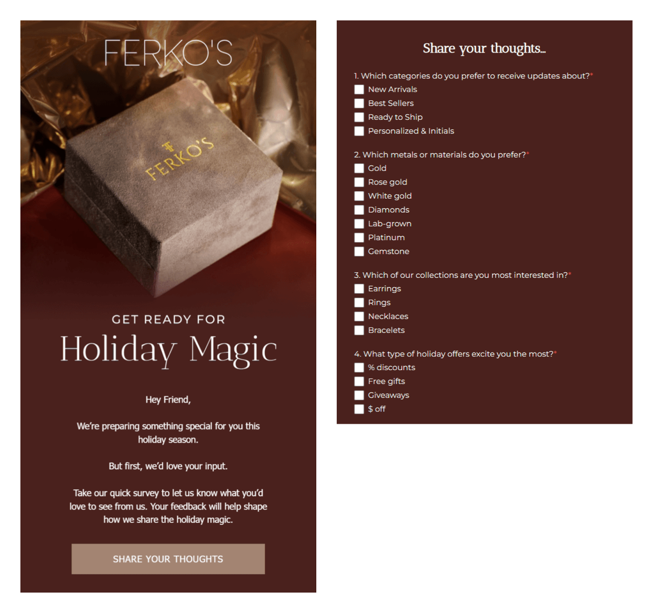 Ferko’s, a jewelry brand, did this by sending a short pre-holiday survey. The email promised “something special,” gathered insights on product interest, and built excitement ahead of Christmas.