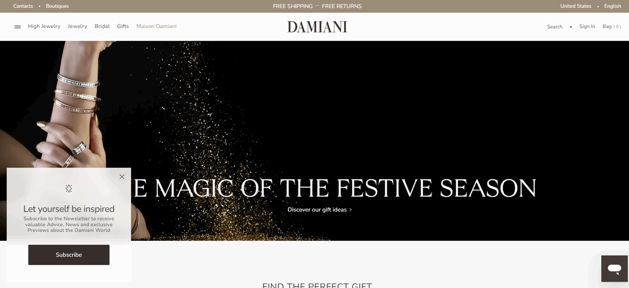 For example, DAMIANI swapped its hero banner for a festive version featuring holiday imagery and copy — a small change that made the site feel fresh and gift-ready.