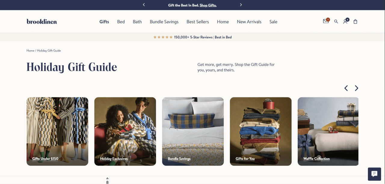 Brooklinen, for instance, organizes its holiday gift guide by category and price range — “Gifts Under $150,” “Holiday Exclusives,” “Bundle Savings” — making the shopping path effortless.