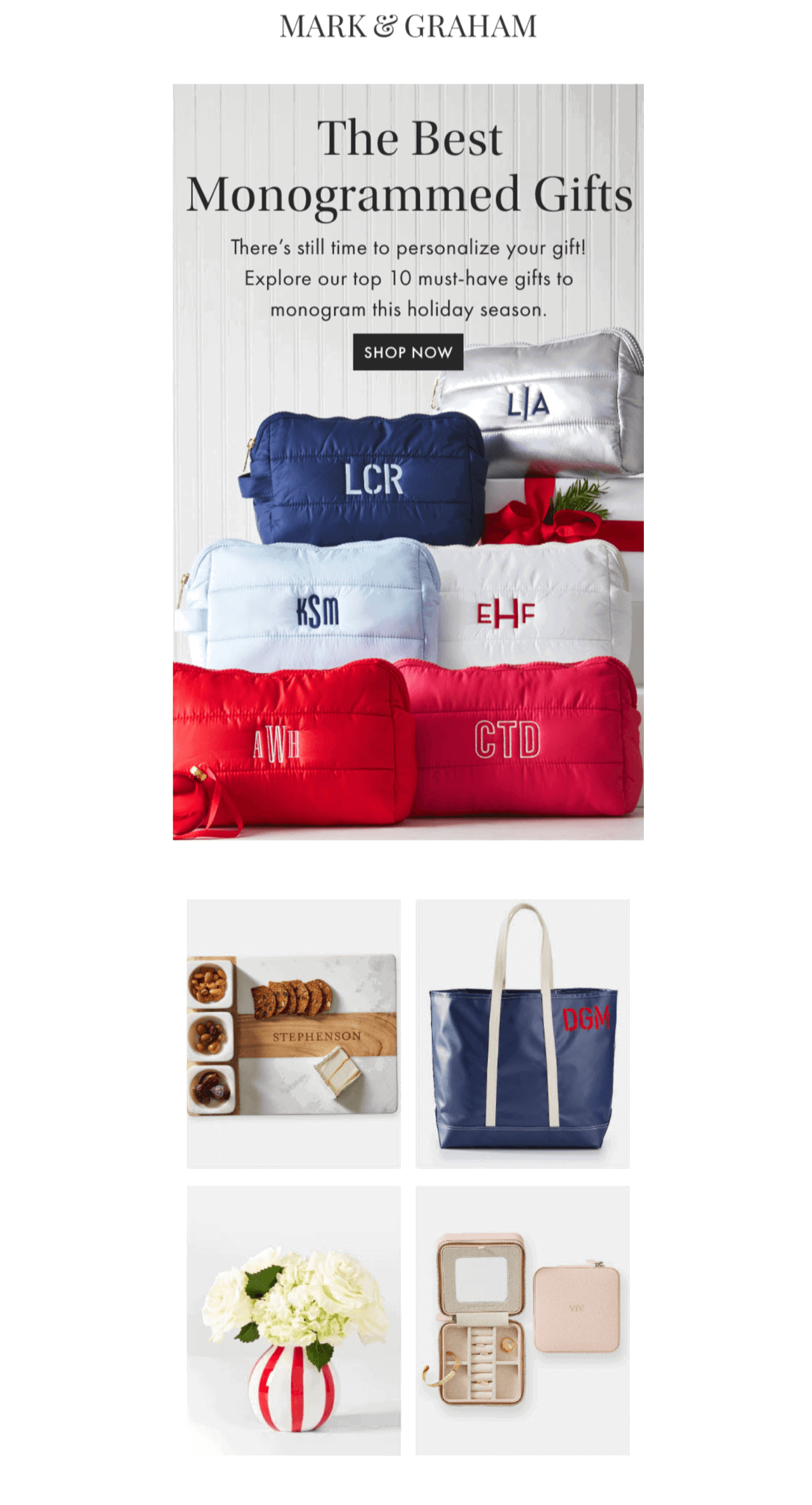 Mark & Graham highlights this beautifully in their holiday email, promoting monogrammed gifts and showcasing their top 10 customizable products.