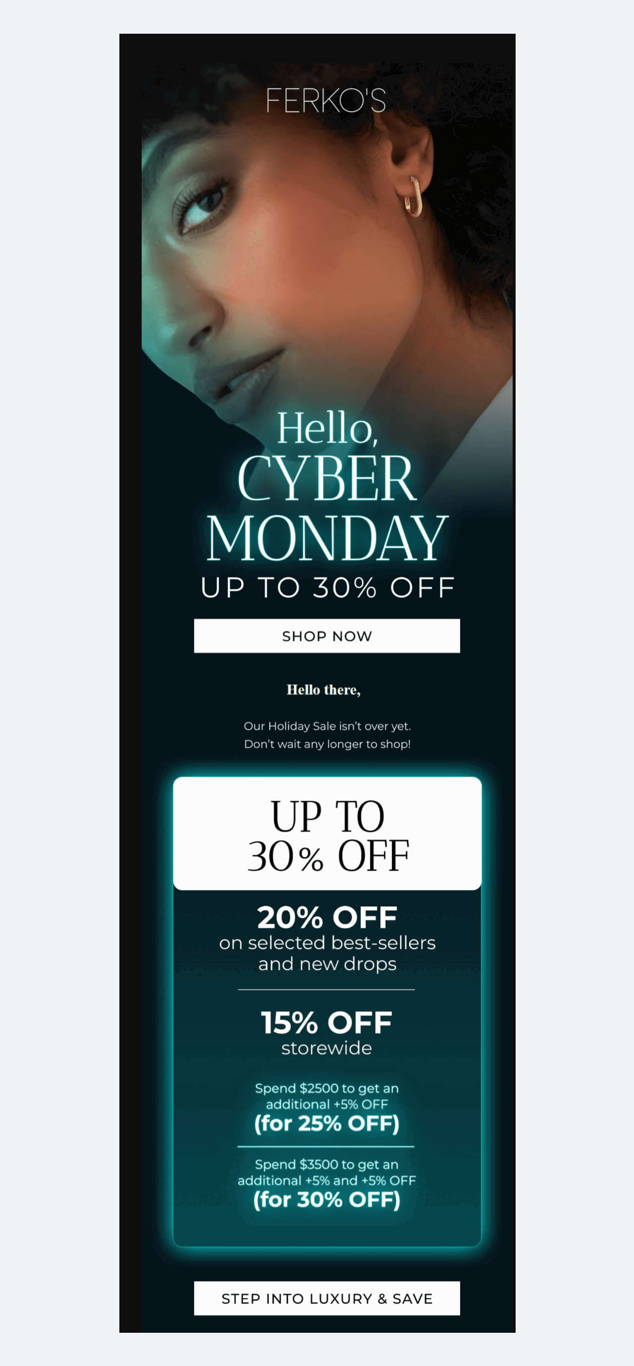 Your Cyber Monday emails should never feel like a reheated version of your Black Friday email deals. Keep them fresh and enticing using bold visuals, countdown timers, and clear CTAs.