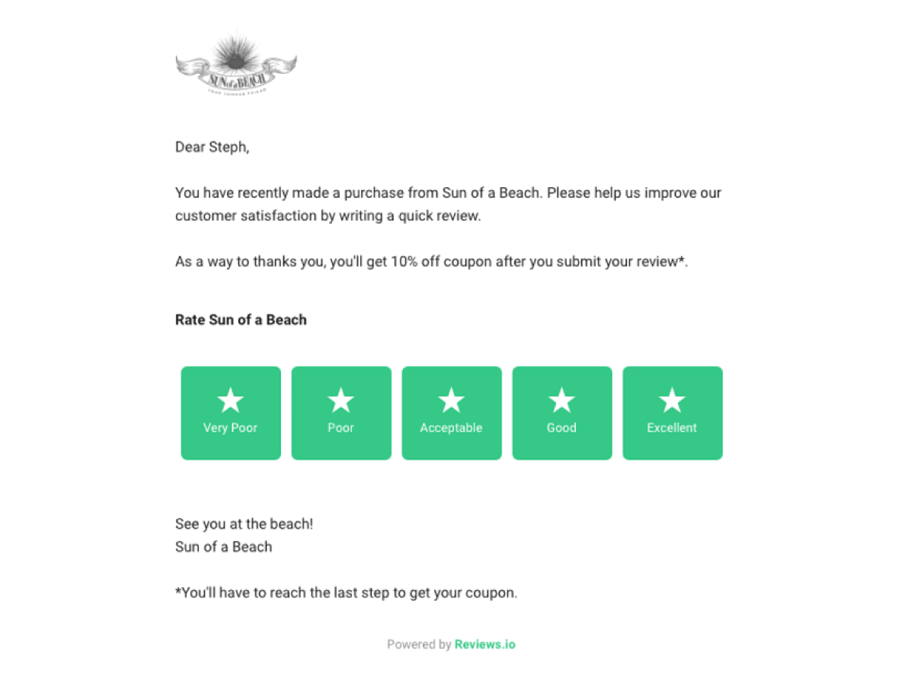 Some brands offer a discount incentive to encourage more people to leave reviews, like the Sun of a Beach in the example above. This not only boosts your credibility but also encourages repeat sales.