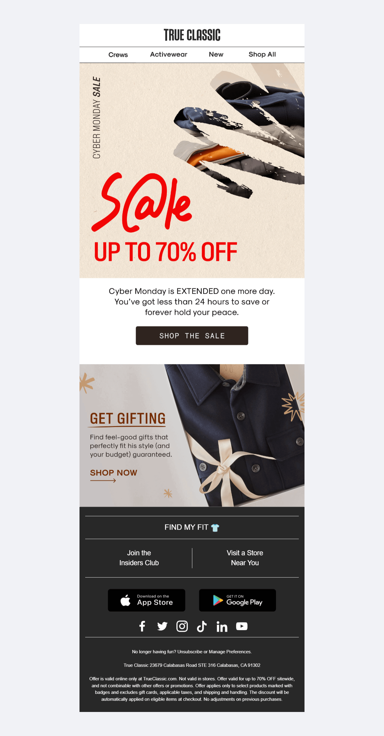 Here is an example of the Cyber Monday sale extension from True Classic, a men’s apparel brand.