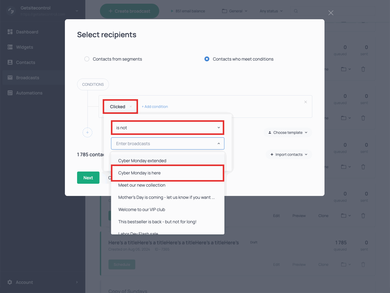 In Getsitecontrol, you can choose promo email recipients based on their previous email clicks