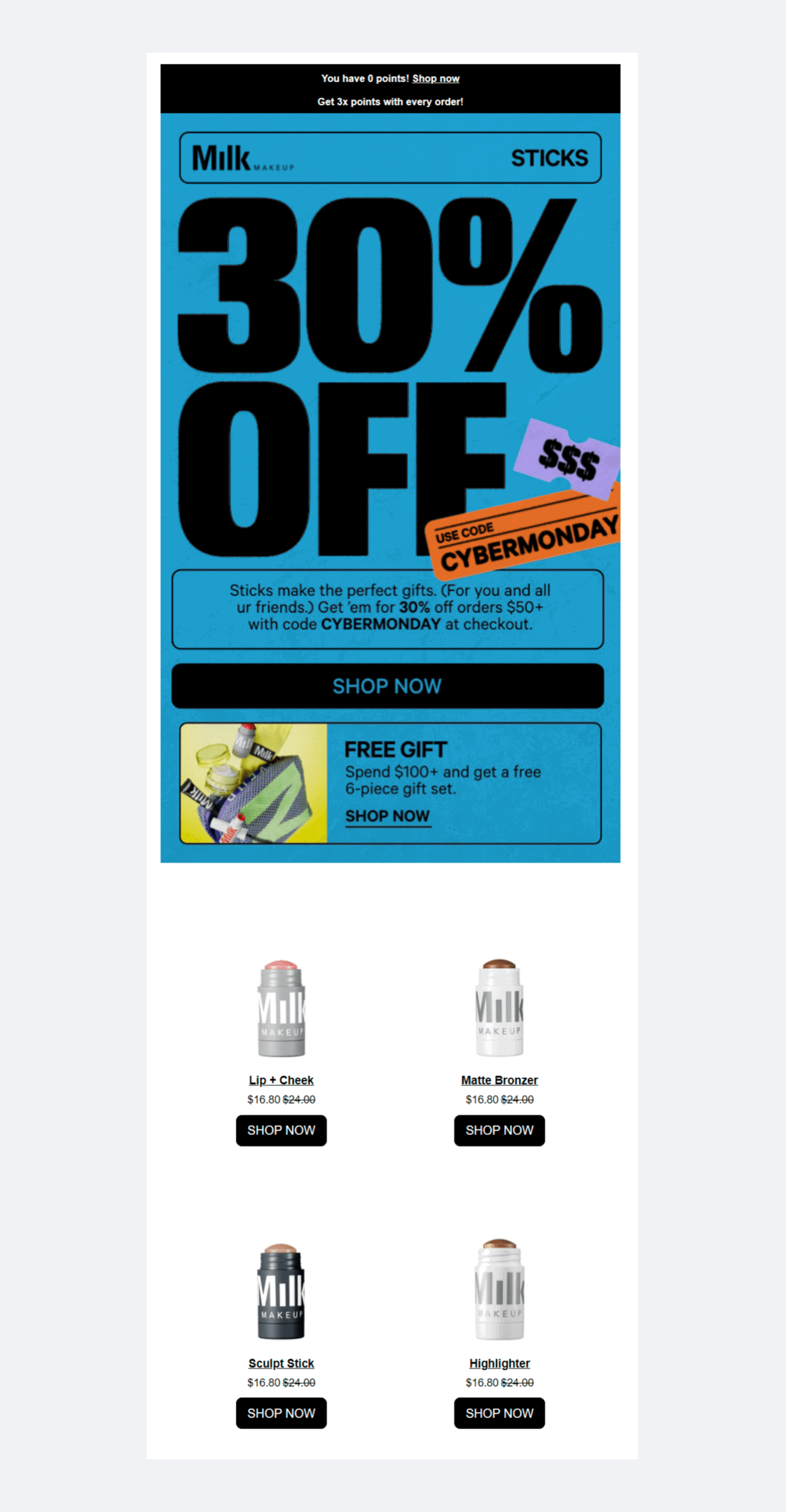 Midway through Cyber Monday, remind your subscribers about the deals they might be missing out on. For example, Milk, a beauty brand, reminds customers about makeup sticks – one of their most popular products on sale that also make a great holiday gift.