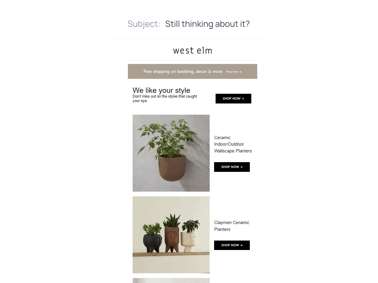 Abandoned cart reminders can help you recover potentially lost sales by reminding customers about the items left in their carts. For example, this is what West Elm sends to those customers who picked products but didn’t complete checkout.