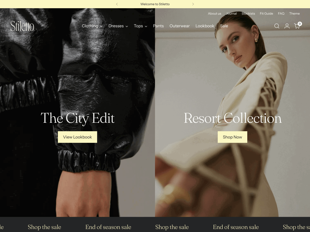 If your brand is built around style and sophistication, Stiletto is one of the strongest Shopify themes to consider. Designed by Fluorescent Design Inc., it’s ideal for high-volume fashion, beauty, and jewelry stores that want a sleek, editorial feel: think lookbooks, video heroes, and shoppable image galleries.