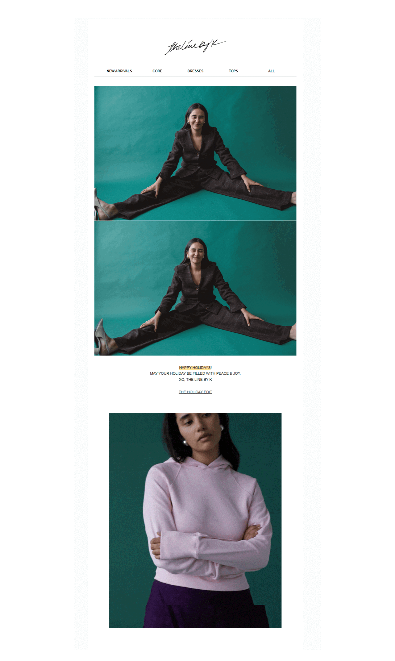 A clothing brand The Line by K sends a short, personal holiday message from the founder. The email features playful photos and just a few words, yet it instantly creates a warm, human connection with subscribers.