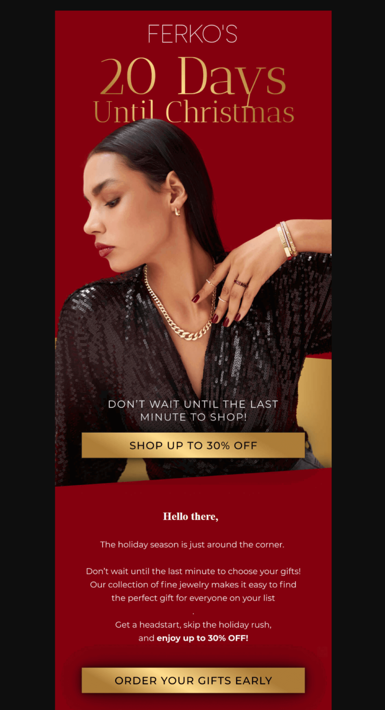 As Christmas approaches, shipping deadline reminders become your most important emails. These emails serve two purposes: they create urgency for fence-sitters and help organized shoppers plan their final purchases. This is one of those emails where you might want to add an animated countdown timer GIF.