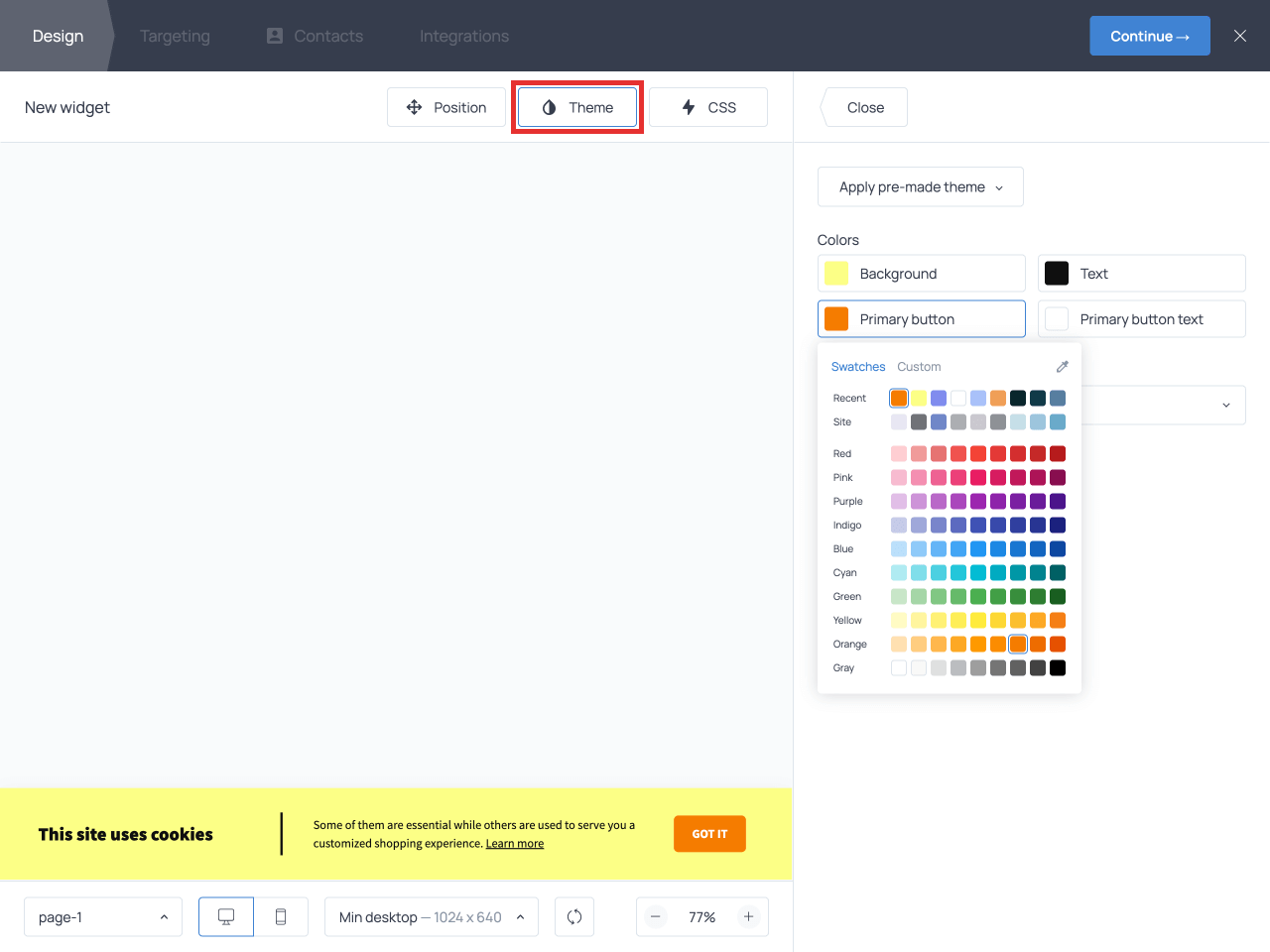 In the gallery, templates are available in two default color themes: black and white. However, if you want your banner’s colors to match the rest of your site, you can do that using the Theme settings. Getsitecontrol allows you to change the font and set the colors for:
