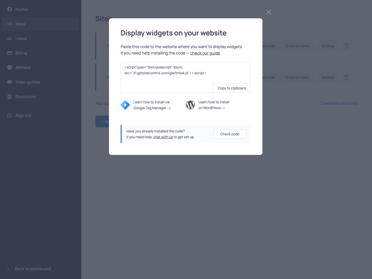 You can also access the code installation guidance from the Getsitecontrol admin dashboard. Go to Account → Sites → Install code and follow the pop-up installation guide or request assistance via 24/7 live chat.