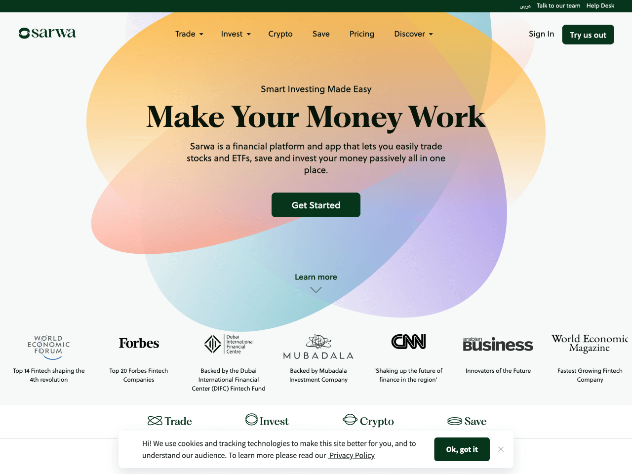 Sarwa’s cookie consent banner sticks to the bottom of the screen and blends well with the brand’s soft, modern aesthetic. The copy is neutral and informative, with a prominent link to the Privacy Policy.