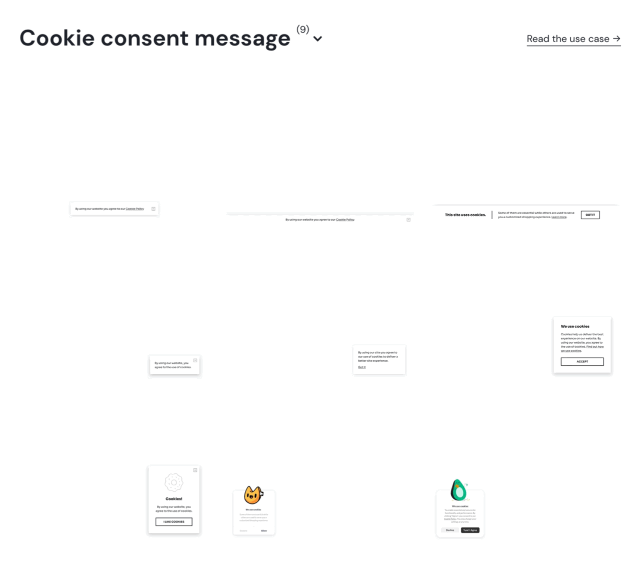 The easiest way to add a cookie banner to your website is to start with a premade template and customize it to match your branding. Visit the template gallery and choose the format you’d like to use on your website.
