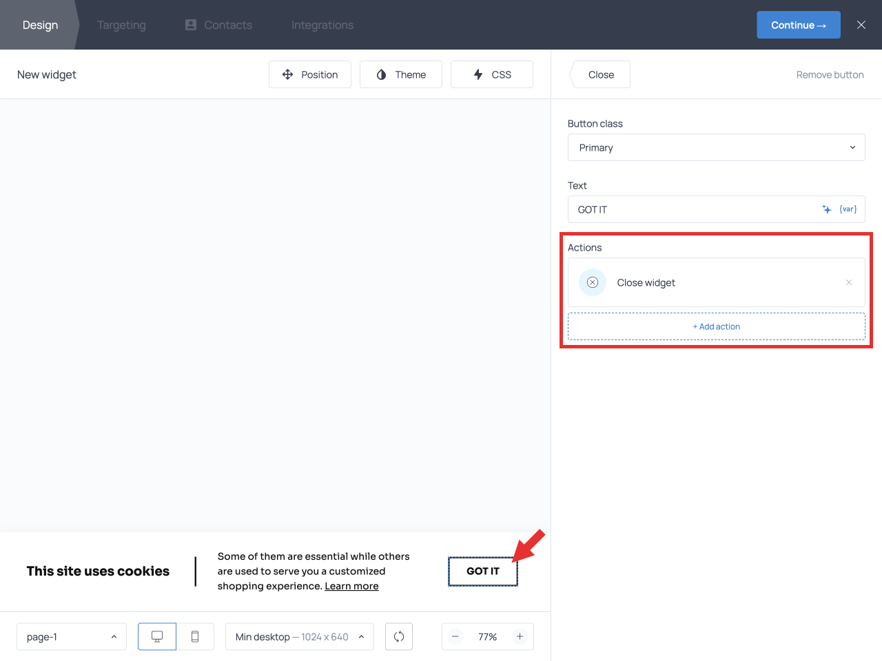 To avoid showing the banner repeatedly, you also want to ensure that the banner stops appearing after a visitor clicks the ‘I agree’ button. This can be set up in the Targeting tab.