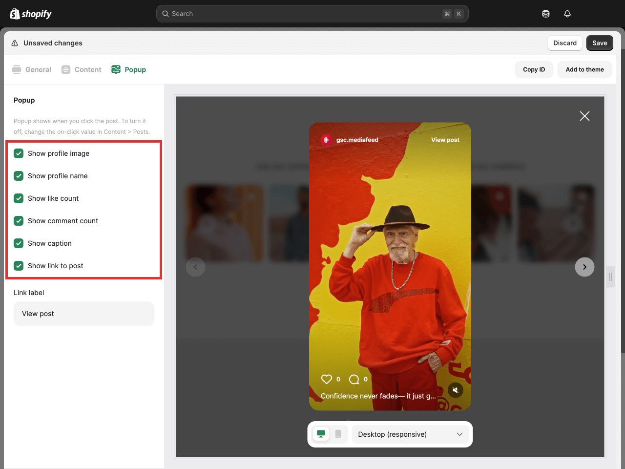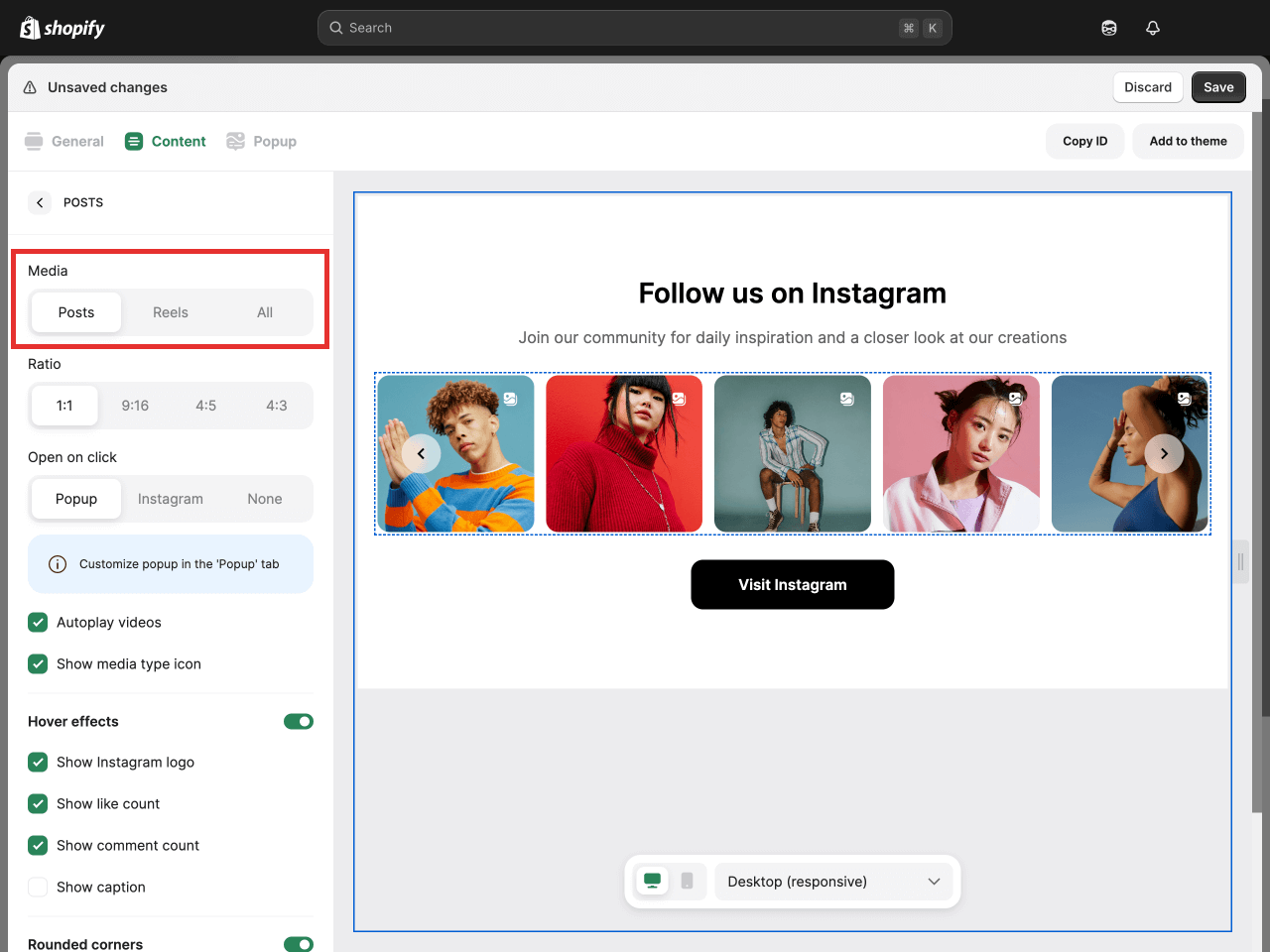 Here, you can also make the posts clickable and decide what happens when a store visitor clicks on them. Choose whether to open an interactive popup, redirect people to the original post on Instagram, or do nothing.