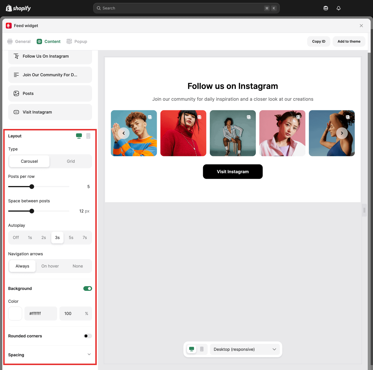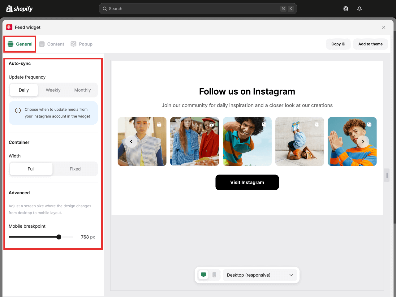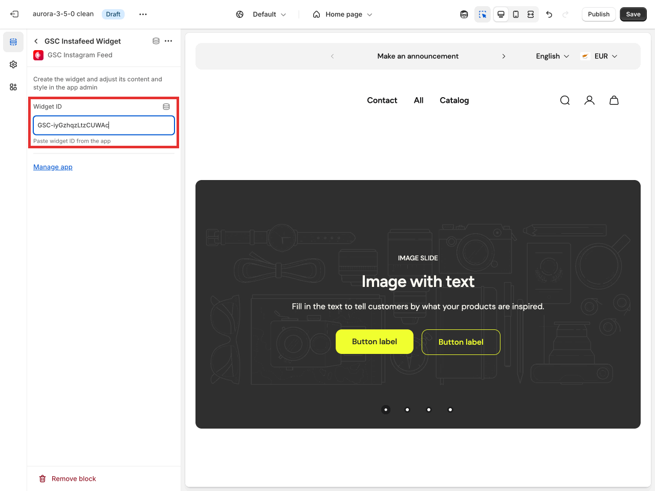 Paste the Instafeed widget ID in the dedicated field and your feed will appear in place.