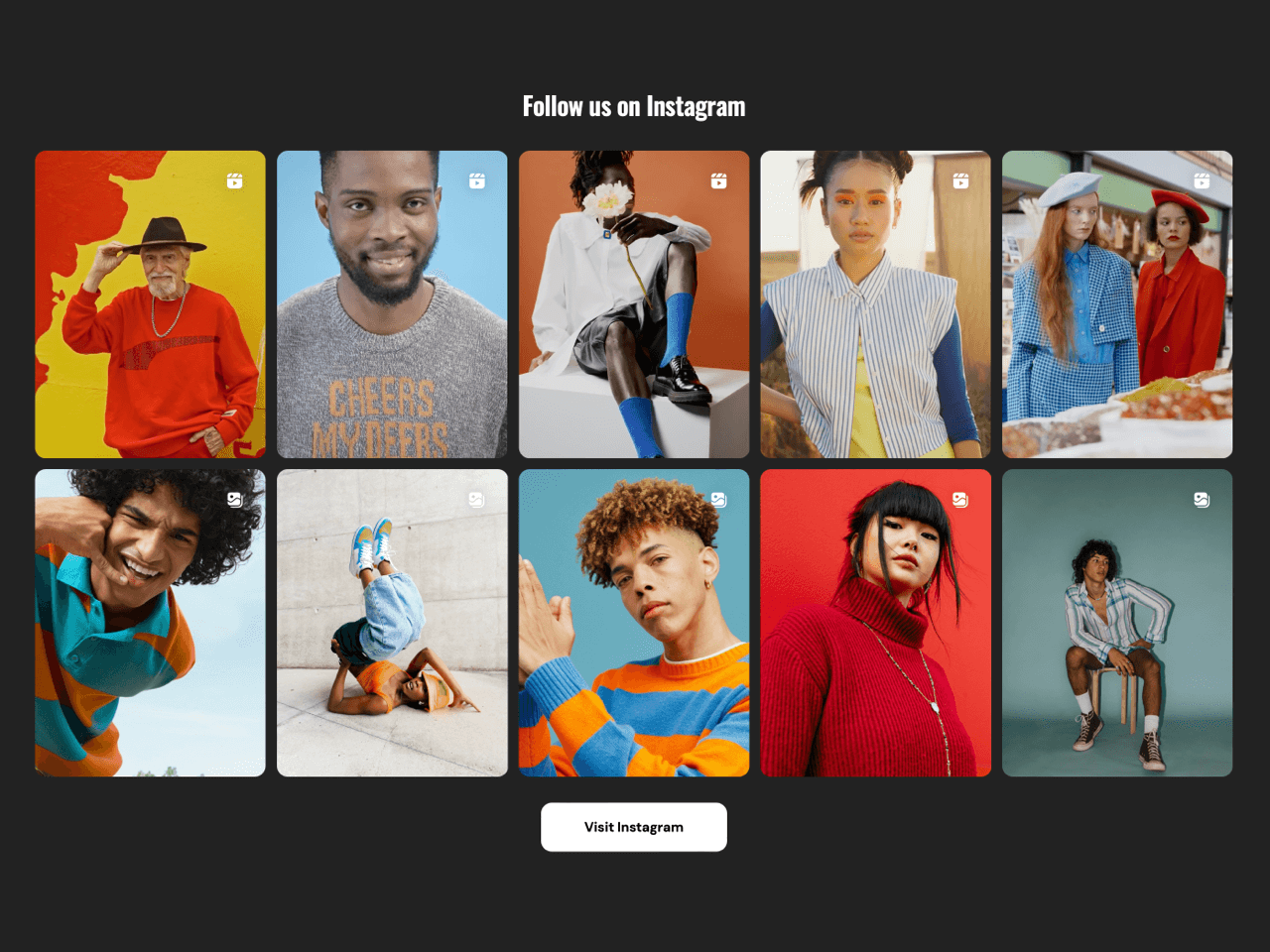 The first Instagram widget is a striking slider with large vertical cards, positioned among the product collections. This format allows customers to take in every detail of their carefully curated collages and elaborate outfits, making the brand’s artistic direction impossible to miss. Here, the key highlights of their feed are front and center, ensuring that visitors get a strong first impression of Contrario’s identity and style.