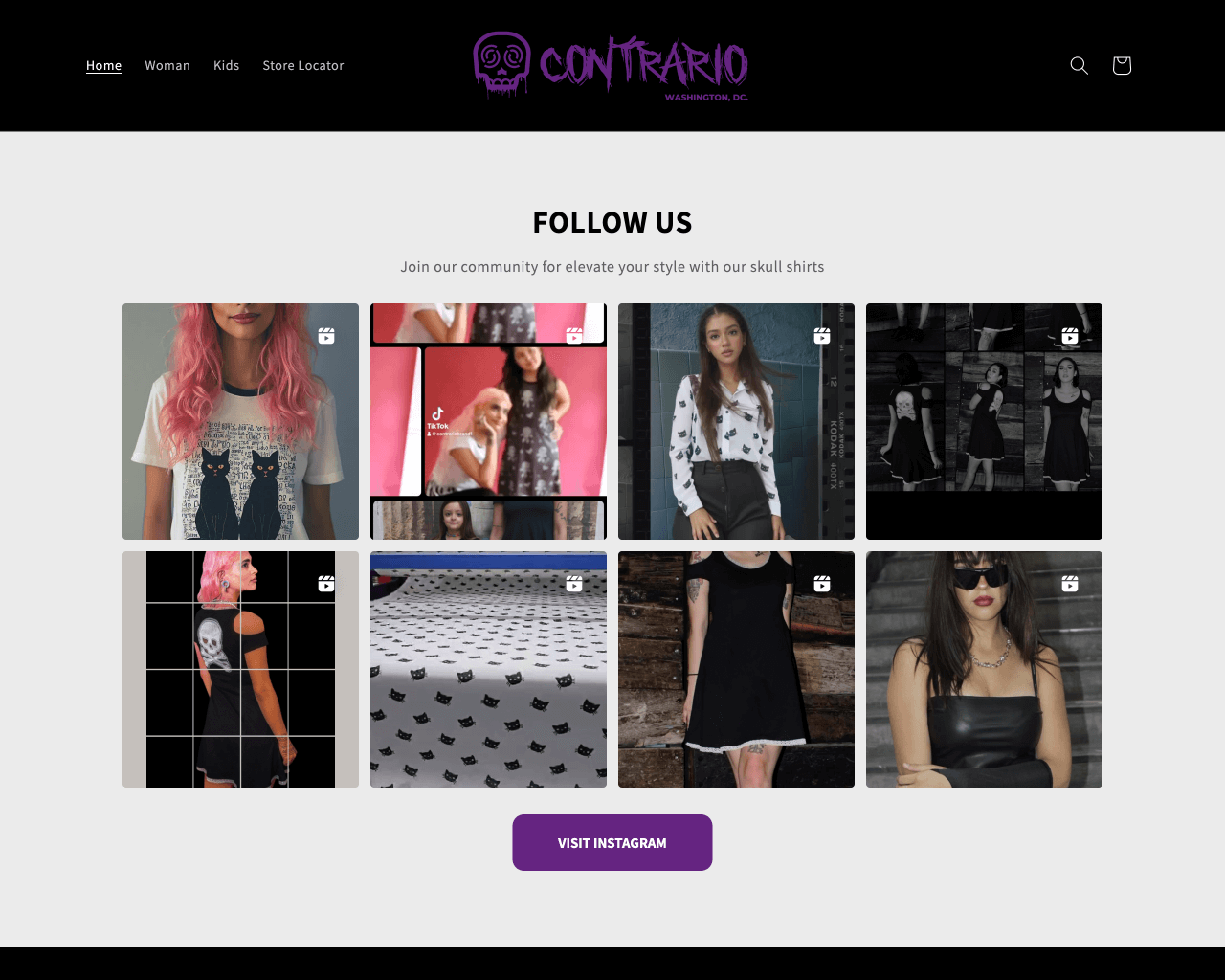 At the bottom of the homepage, a second widget displays a neat grid of square cards, showcasing the full Instagram feed in one glance. This layout makes it easy for visitors to explore more content and follow the brand on Instagram. Both Contrario’s widgets stand out with a subtly contrasting background that makes them pop against the main store design, while signature purple buttons tie them into the brand’s aesthetic.
