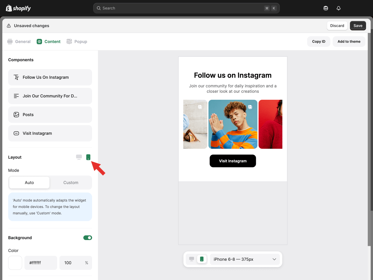 Choose whether to use the Auto layout with predefined settings for the best look on mobile devices, or switch to Custom mode to reveal the list of settings for manual adjustment.