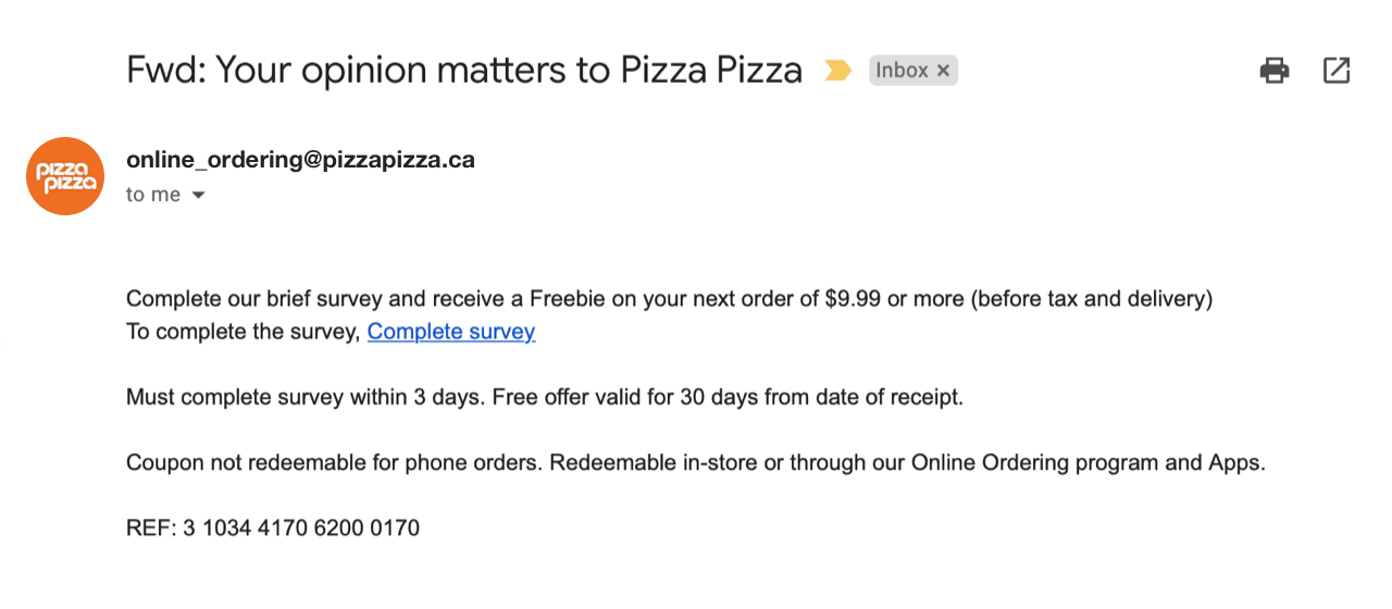 You can also offer this monetary reward as a voucher to be used on the next purchase, like Pizza Pizza: