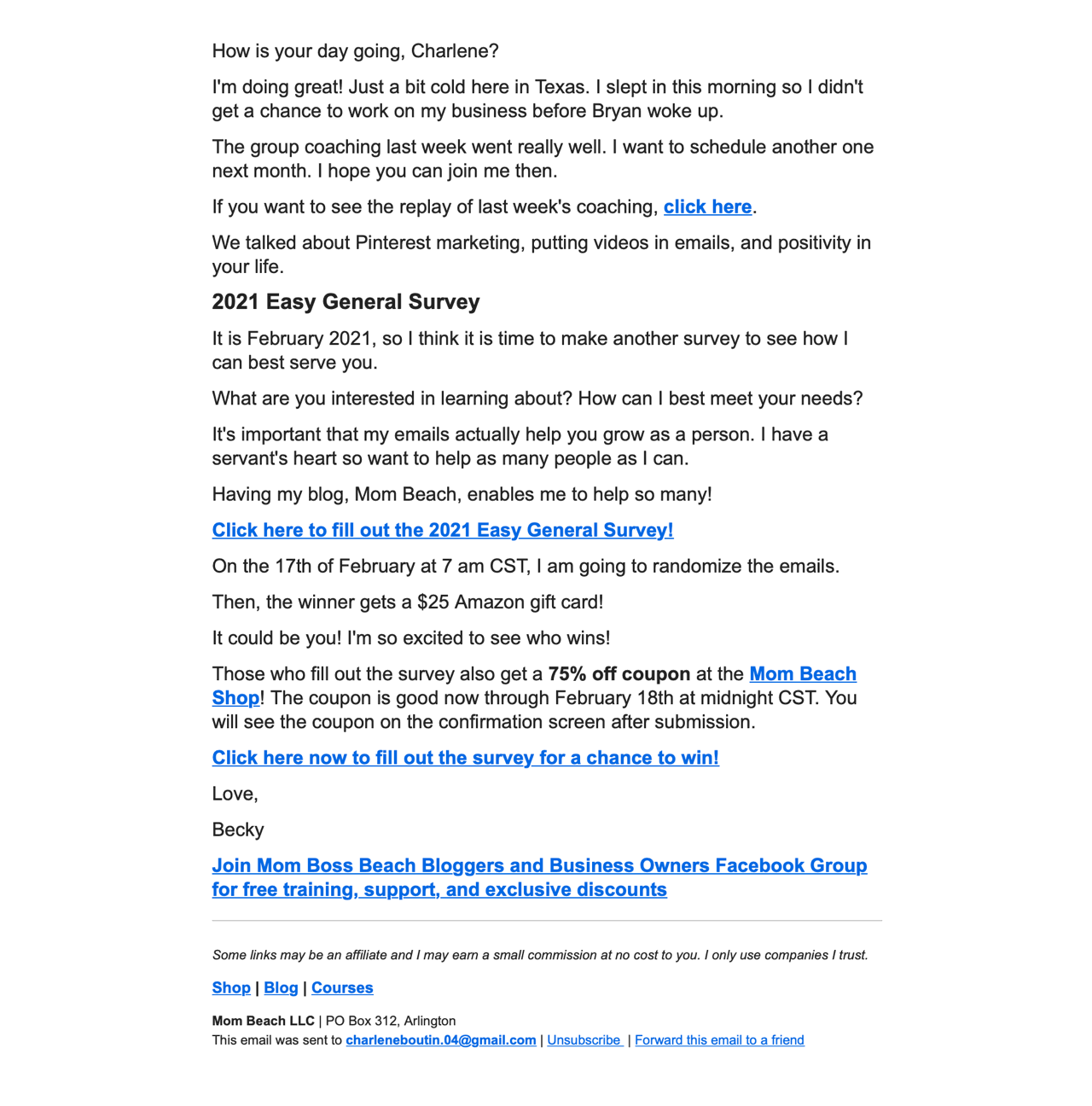 If you offer digital products, you can offer even bigger coupons, like Becky from MomBeach: